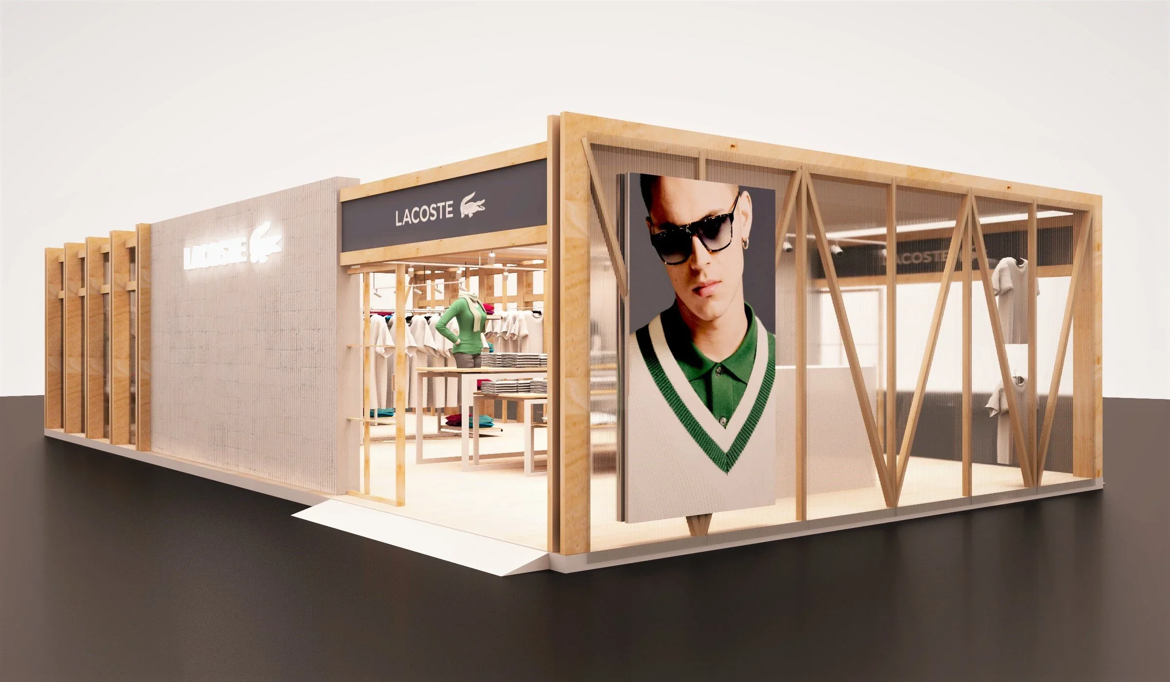 Bespoke design for a Pop-Up Store created for Lacoste Mexico. Inspired by their iconic aesthetic and design, we developed an environment surrounded by top tier materials, such as wood, raw concrete, and polished metal. We wanted to remind the customers of Lacoste stores all around the world, while having a unique feeling and visual style.